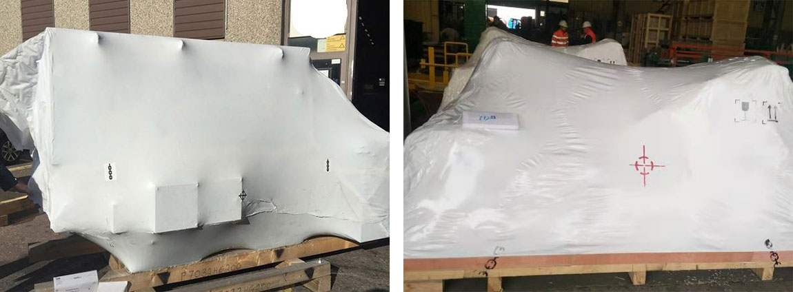 熱縮包裝:適用于一些不能疊放運(yùn)輸,只需要防水、防塵的大尺寸或不規(guī)則的物體包裝,尤其是電梯行業(yè)的扶梯產(chǎn)品多用此包裝。屬于簡(jiǎn)易低成本包裝類